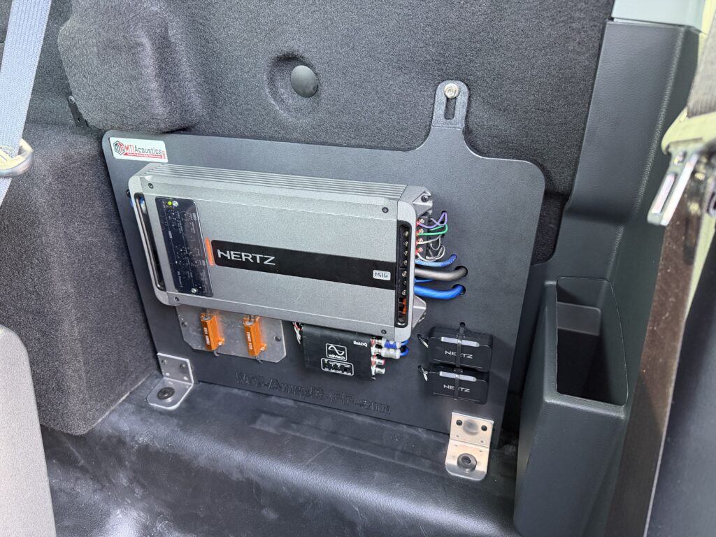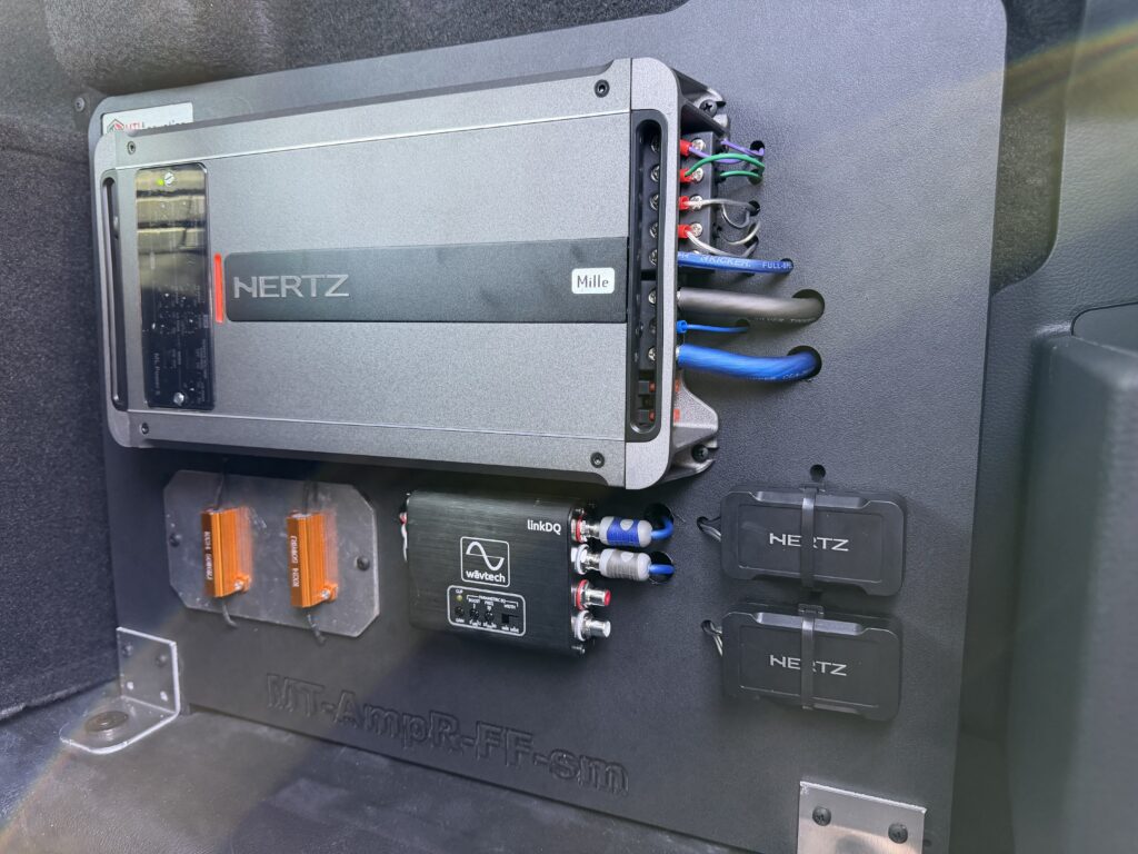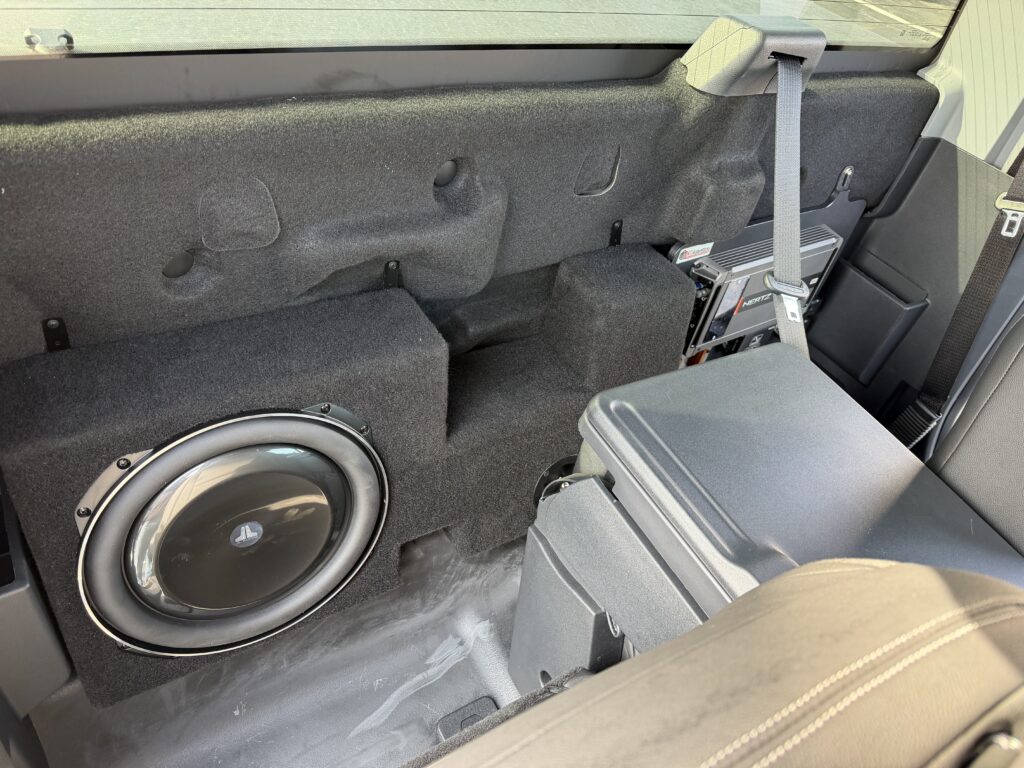 We had the pleasure of working on this 2025 Ford F150 regular cab truck brought to us by a returning customer. This truck has been completely built up with horsepower and it was time to make the audio match! We installed Hertz MPx690.3 speakers in the front door to bring that full stage audio alive. Next we added Hertz ML28.3 Tweeters in the front A-pillar to make the highs a little more present to compliment the added subwoofer. Next the truck got a custom subwoofer box that got matched to a JL Audio 13TW5 13.5″ shallow mount subwoofer to make sure our customer really “feels the bass”! To finish this beast off, we installed a custom amp rack to house the crossovers, resistors and to properly display the workhorse of this system. The MLPower5 roars this audio alive providing 2- channels for the 6×9’s and 2 channels for the tweeters and providing 550 watts for the JL Audio 13.5″ sub. The audio in this truck will make our customer smile for years to come! After throwing some tint on this beauty all we have left was to deliver it! Stop by AudioWorks and let us help you build your dream audio system!
