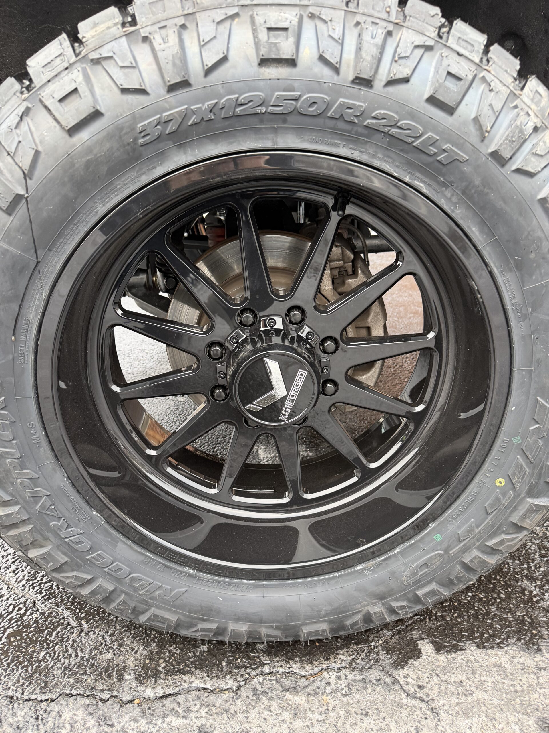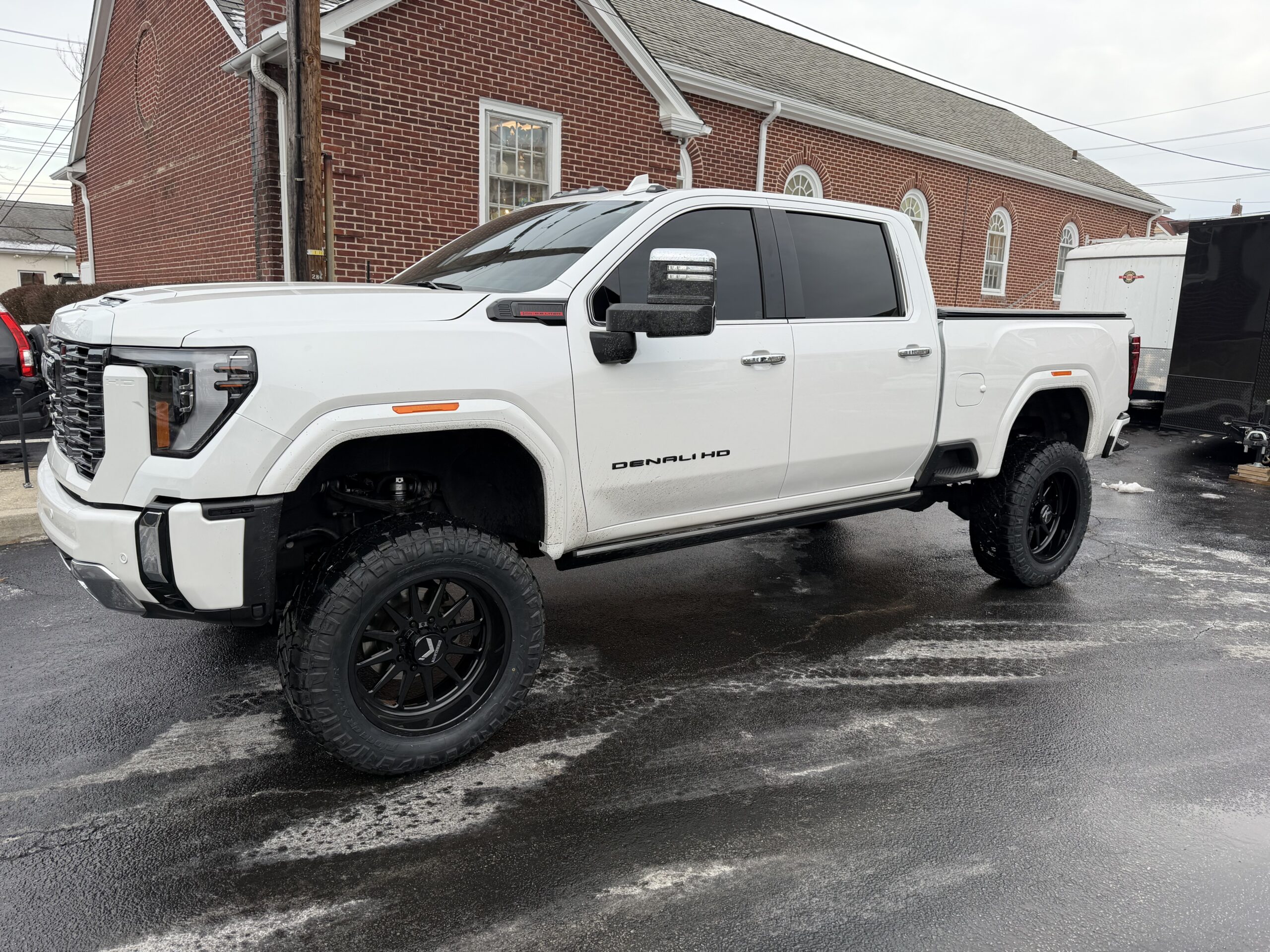 This beautiful truck came to us pretty much stock. Customer wanted 37’s and we made it happen! This beautiful 2024 GMC Denali 2500HD was fitted with a 6″ Lift Kit with Fox Shocks. We tossed some new shoes on using KG1 Forged rims with 37 Ridge Grappler Tires. We finished up this monster with a chrome delete grille, body painted splash guard delete’s and a steering stabilizer to make sure this Denali wont struggle with these beautiful 37’s. Come get a free estimate to upfit your vehicles suspension!