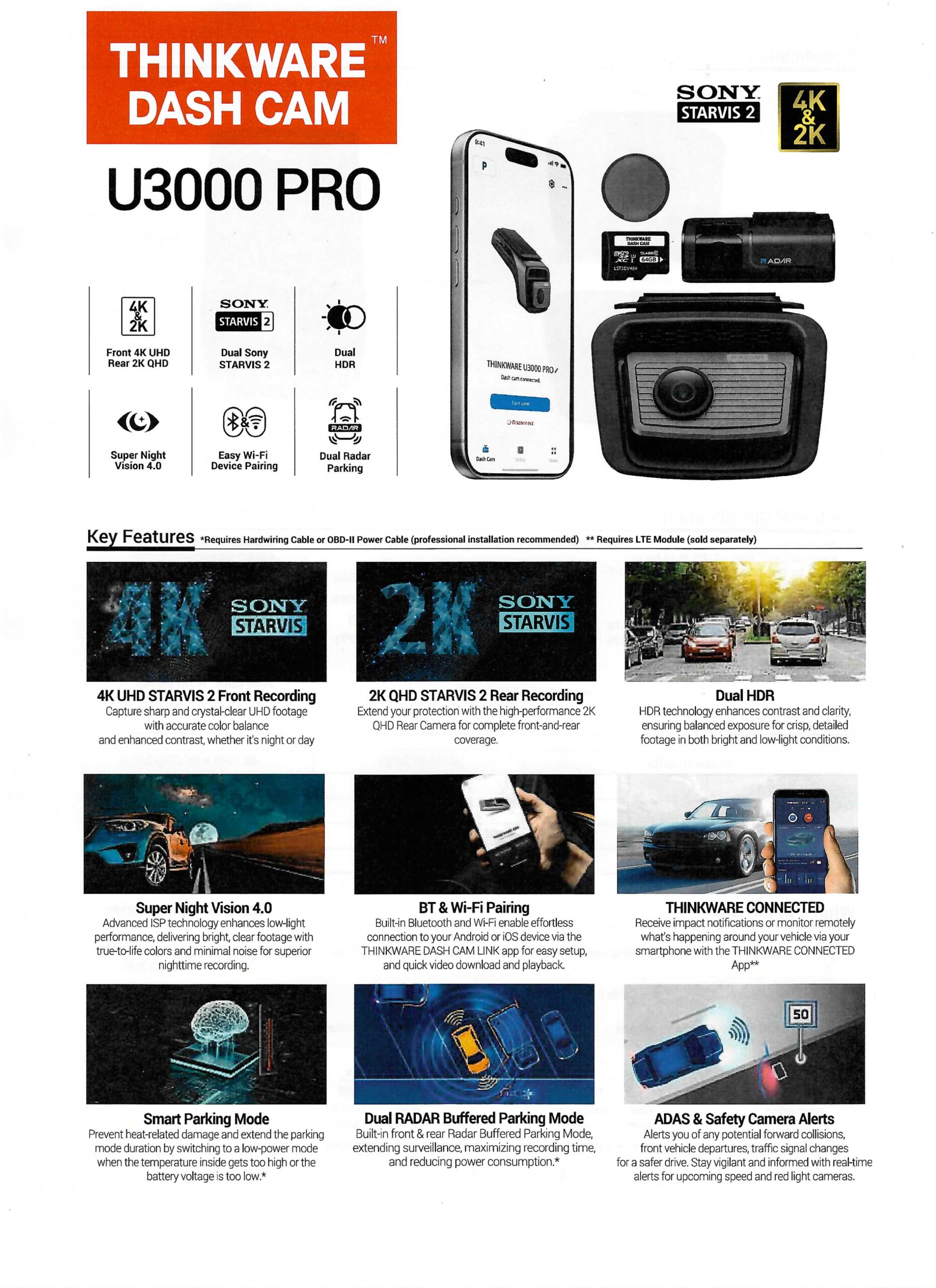 Thinkware has done it again! Introducing the new U3000PRO dash camera. Offering one of the best dash cameras available today. The U3000PRO is an amazing upgrade from its predecessor the U3000. This camera offers a Starvis 4.0 4K front camera and Starvis 2.0 2K rear camera ensuring true HD quality video while also incorporating Thinkware’s Superior Night Vision 4.0! Advanced ISP technology enhances low-light performance, delivering bright, clear footage with true-to-life colors and minimal noise for superior nighttime recording.